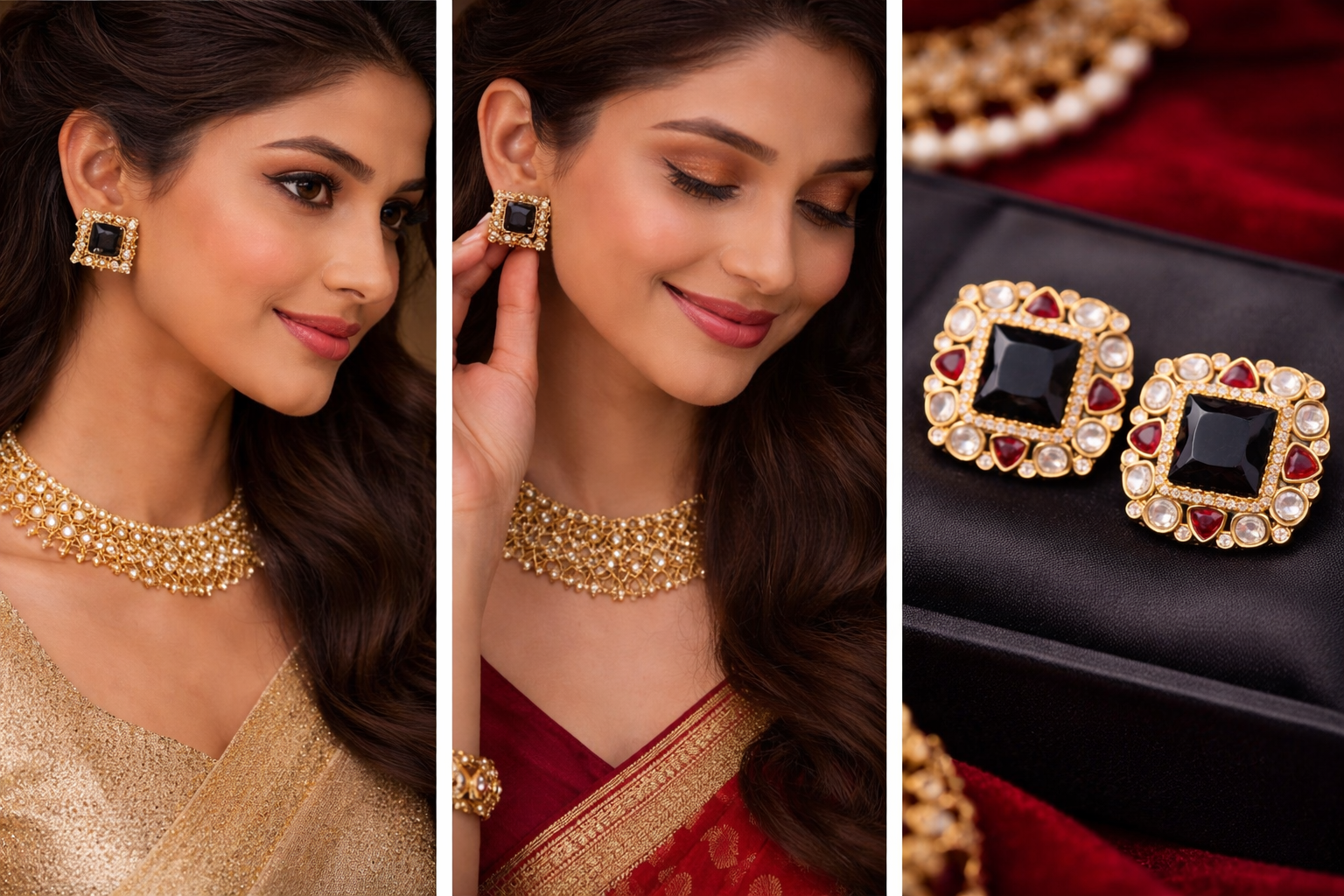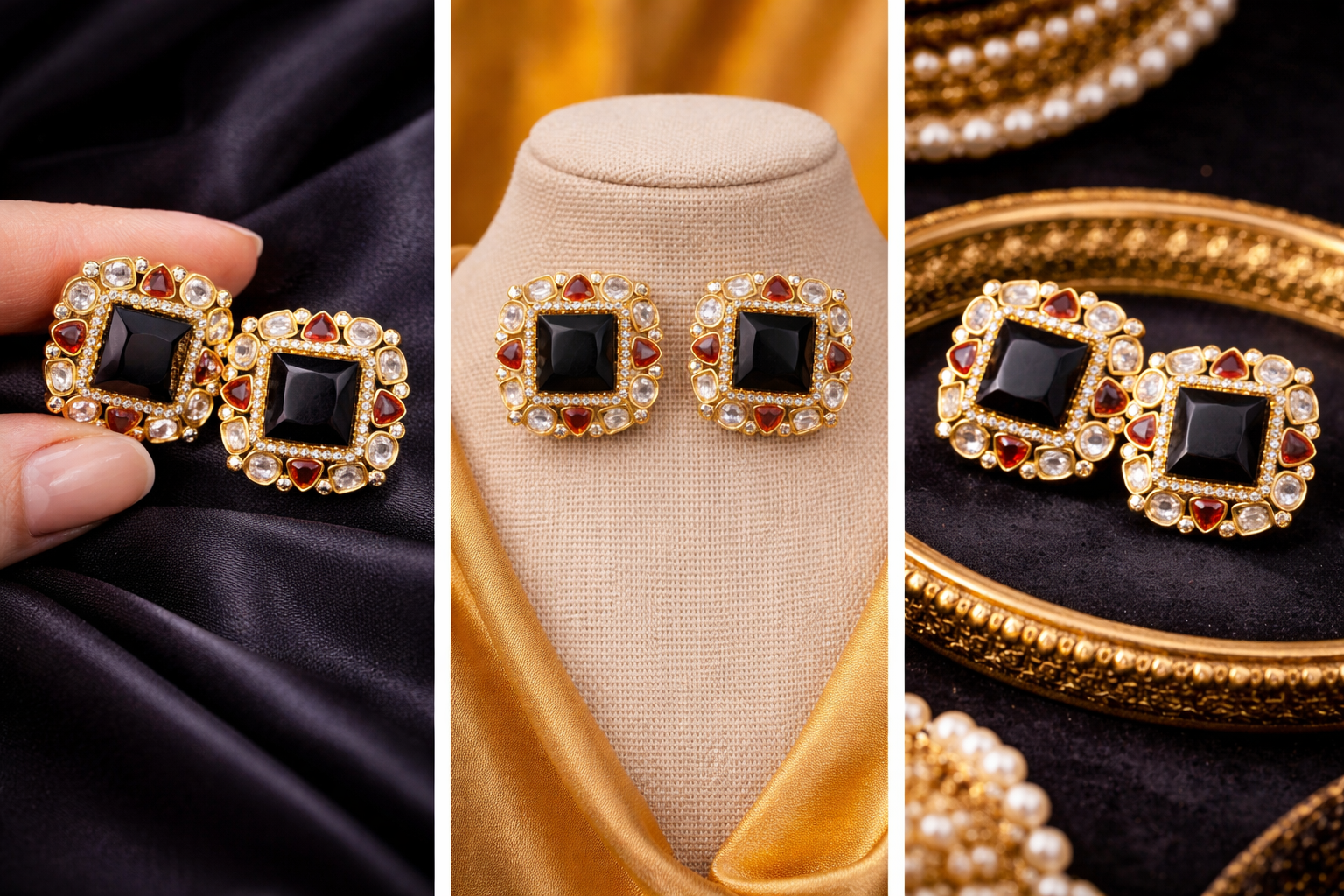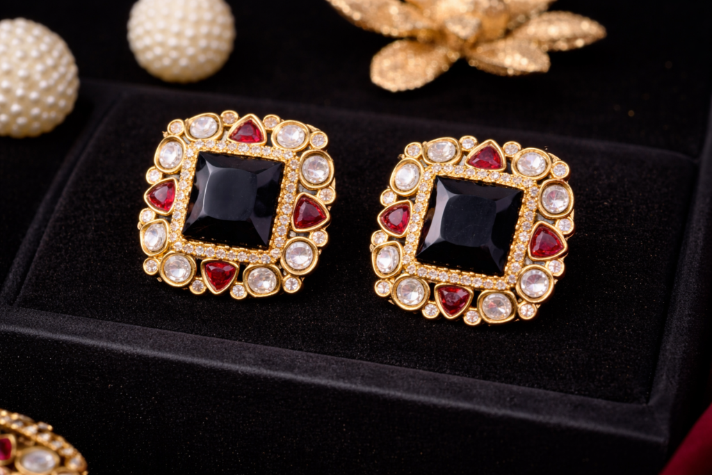 Elegant square stud earrings crafted with a deep black onyx center stone, bordered by finely set kundan-style clear stones and ruby-red accents in a rich gold-tone finish. Designed to highlight traditional craftsmanship with a bold, royal look, these earrings are perfect for festive wear, weddings, and special occasions. A versatile statement piece that adds depth and sophistication to ethnic and Indo-western outfits.