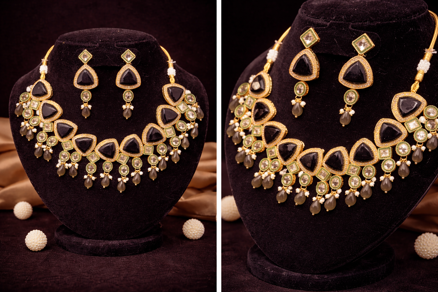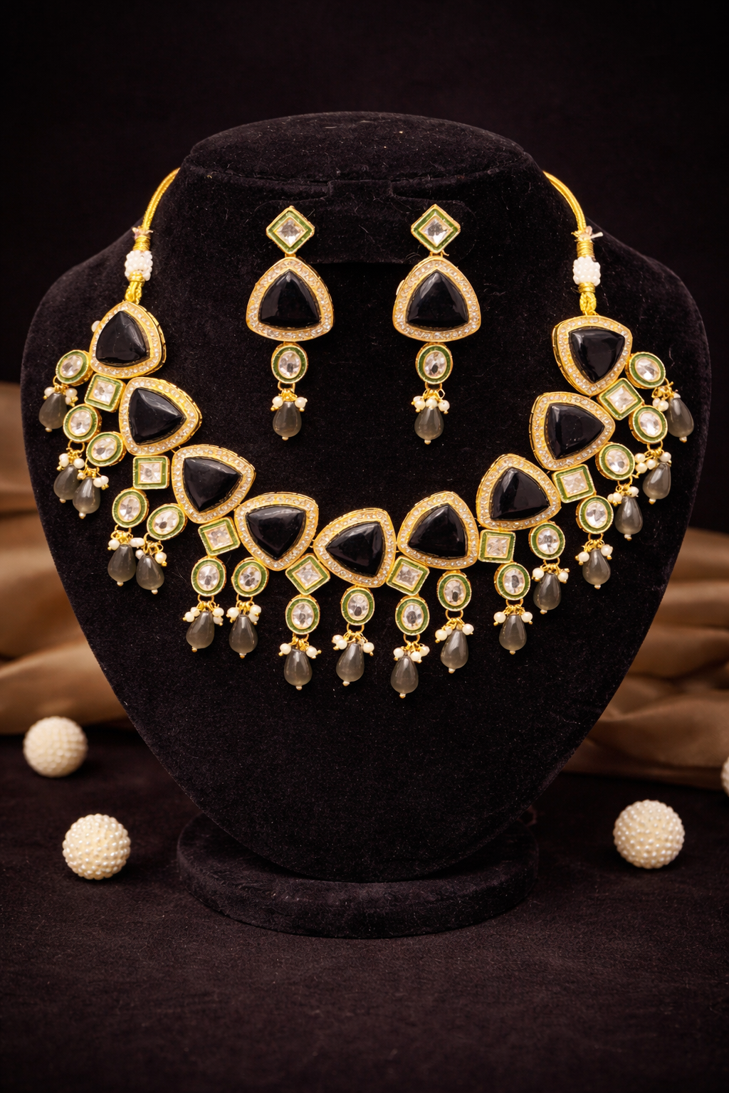 The Noorika Black Pearl Bridal Choker Set is a statement bridal ensemble crafted for timeless elegance. Featuring bold black stone motifs bordered with fine gold detailing, this set is beautifully accented with pearl drops that add grace and movement. The matching earrings mirror the choker’s design, creating a perfectly coordinated look.