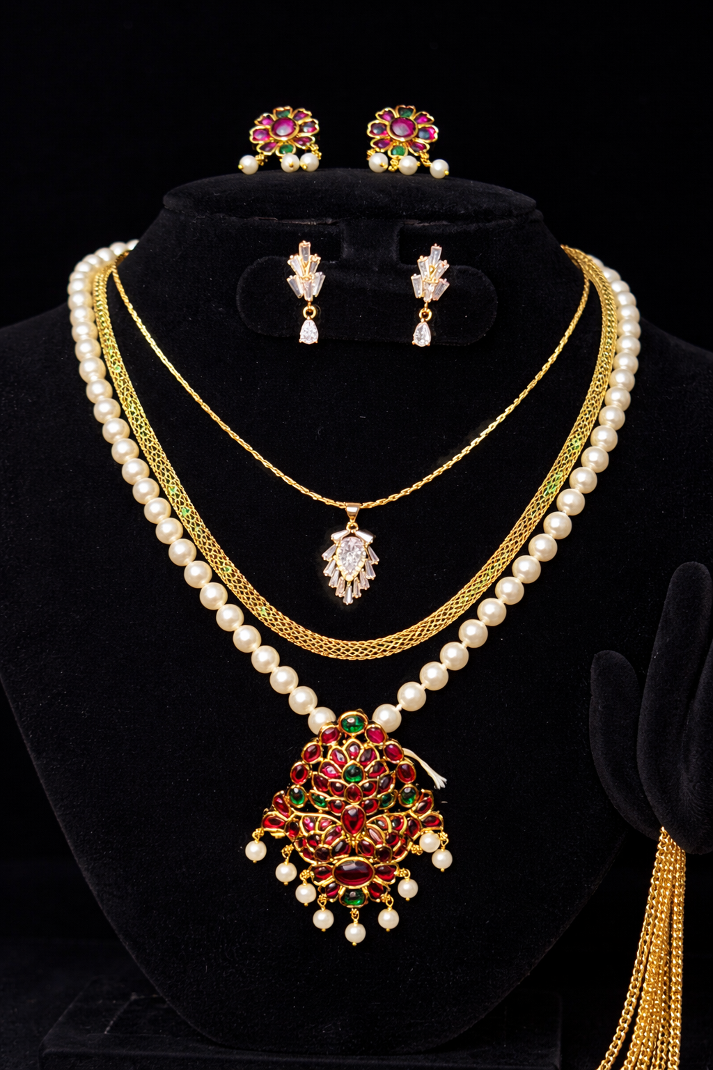 & Free ShippingA graceful fusion of pearls, kundan stones, and gold-tone detailing. This layered pendant set is designed for refined occasions, offering a timeless look that complements both traditional and festive outfits.