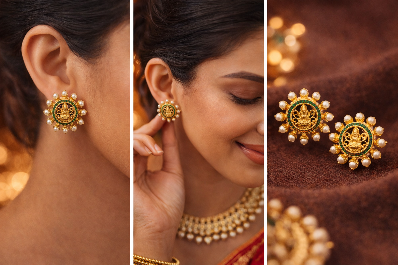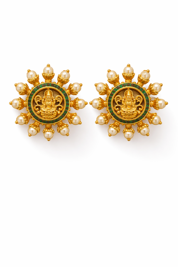 Celebrate tradition with these exquisite pearl and green stone temple earrings, designed with a classic gold finish and a finely detailed central motif. Encircled by luminous pearl drops and highlighted with rich green stone accents, these earrings bring together elegance and heritage in perfect harmony. An ideal choice for festive celebrations, weddings, and traditional occasions, they beautifully complement sarees, lehengas, and ethnic attire.