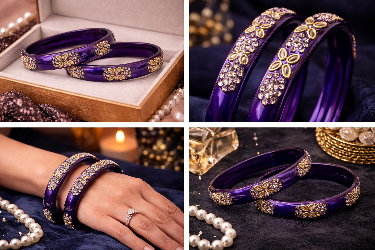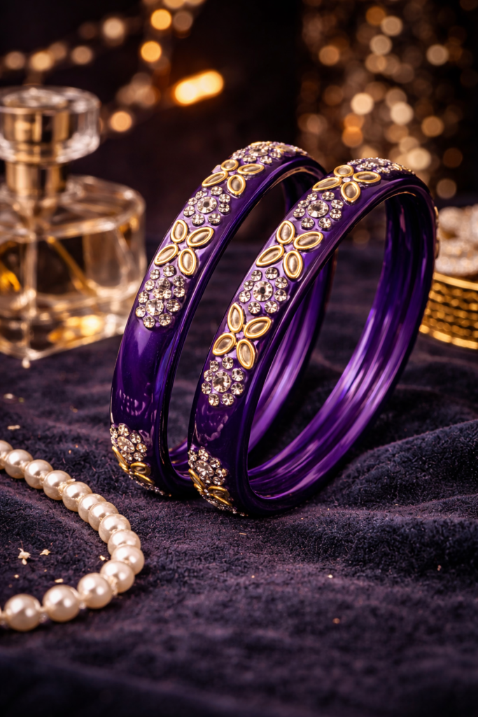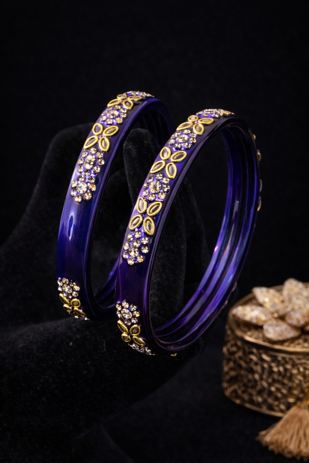 An elegant Purple&dark-blue bangle adorned with intricate kundan-style stone detailing and gold-tone floral accents. Designed to add a rich, festive charm to both traditional and party wear. Perfect as a statement piece or to pair with matching bangles.