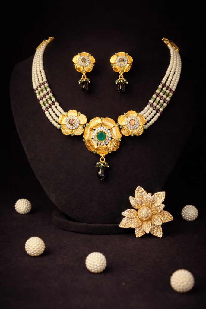This elegant pearl choker set features a timeless design crafted to highlight traditional beauty with a refined finish. The necklace is adorned with multi-strand pearls and a floral gold centerpiece, enhanced with subtle gemstone detailing for a rich, classic look.