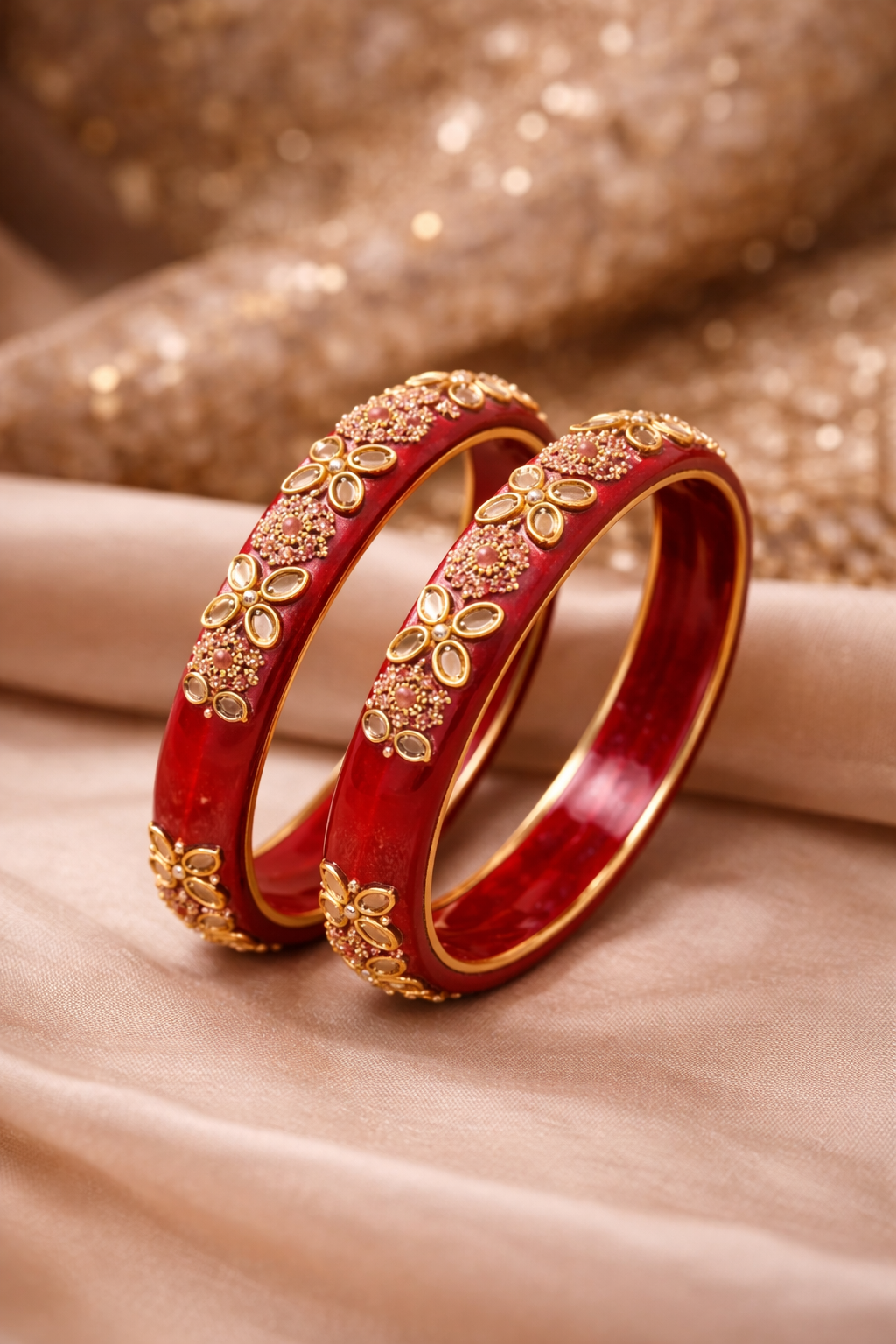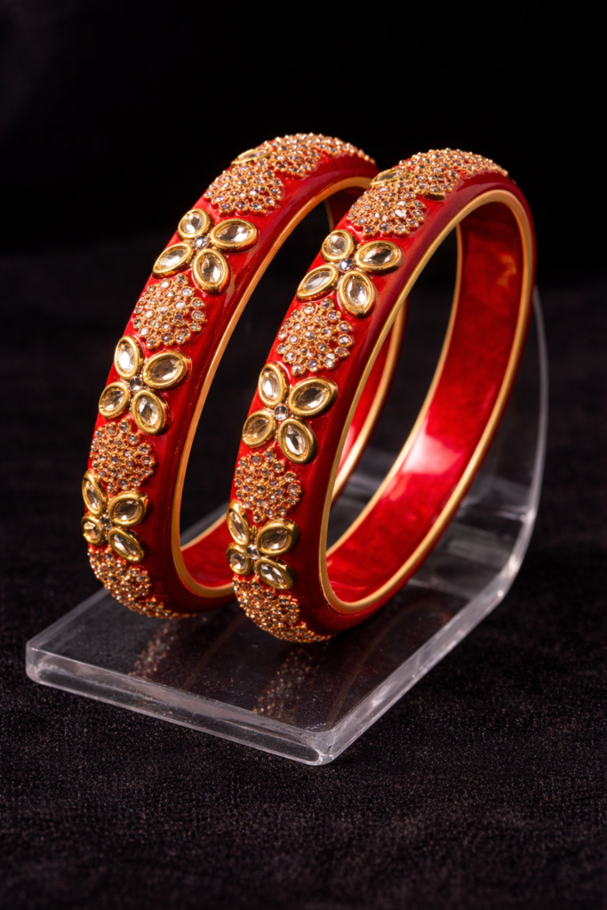 An elegant red bangle adorned with intricate kundan-style stone detailing and gold-tone floral accents. Designed to add a rich, festive charm to both traditional and party wear. Perfect as a statement piece or to pair with matching bangles.