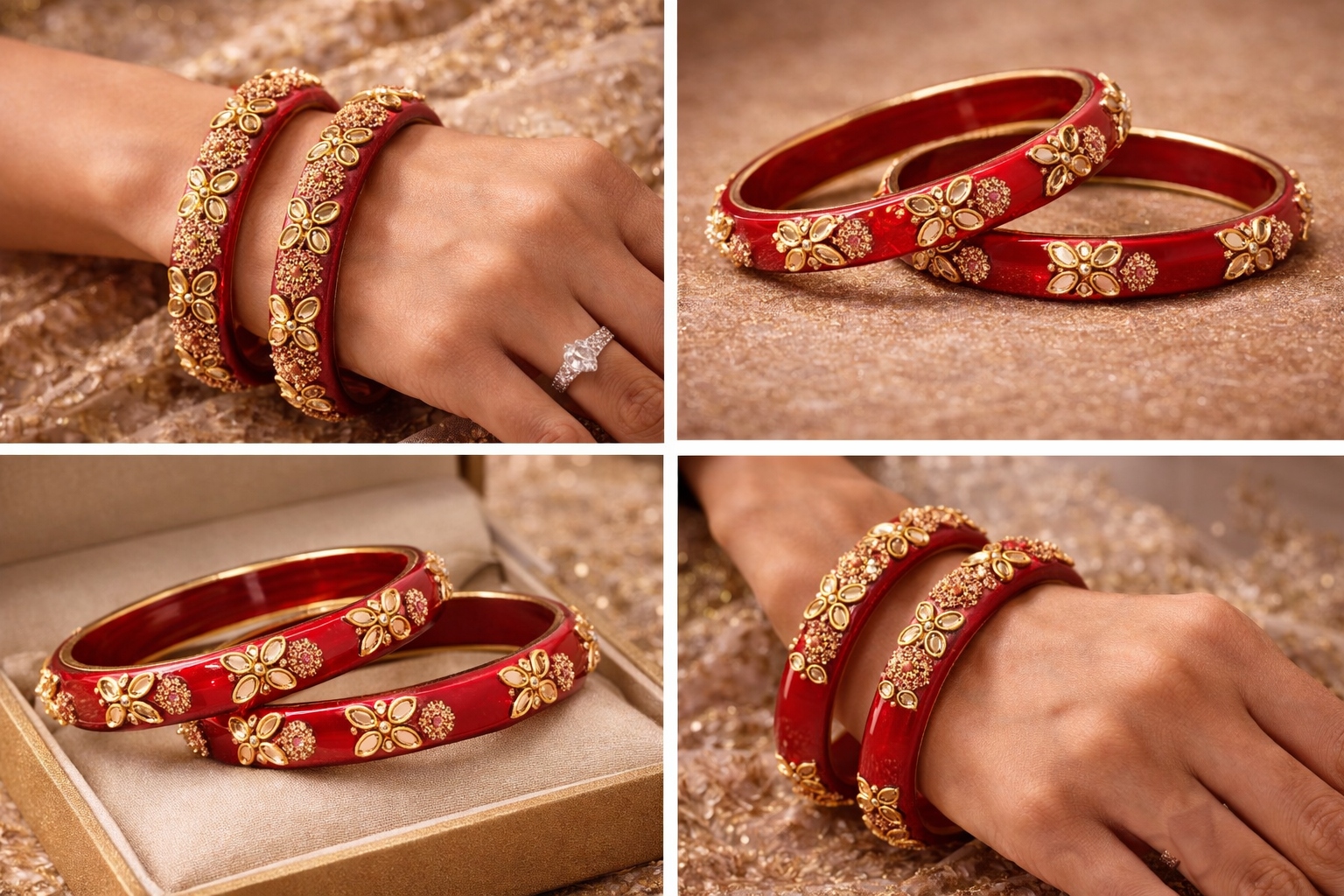 & Free ShippingAn elegant red bangle adorned with intricate kundan-style stone detailing and gold-tone floral accents. Designed to add a rich, festive charm to both traditional and party wear. Perfect as a statement piece or to pair with matching bangles.