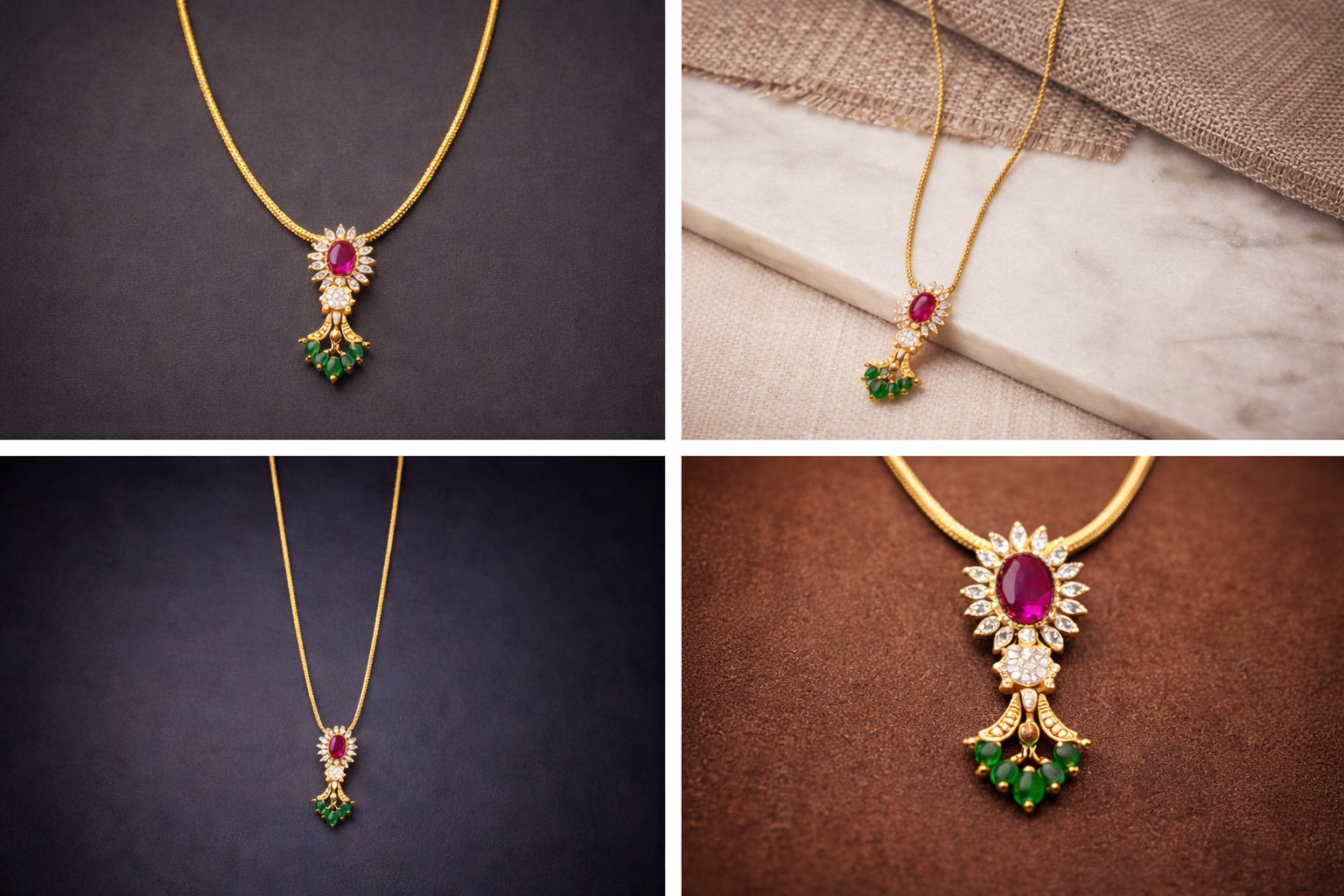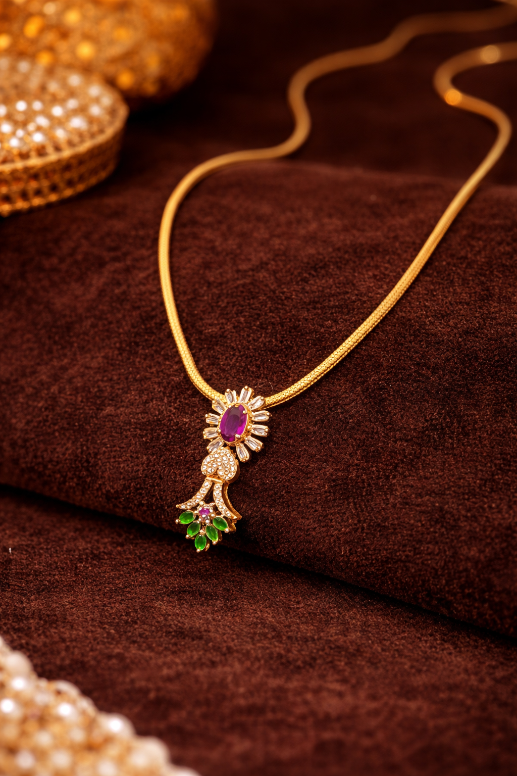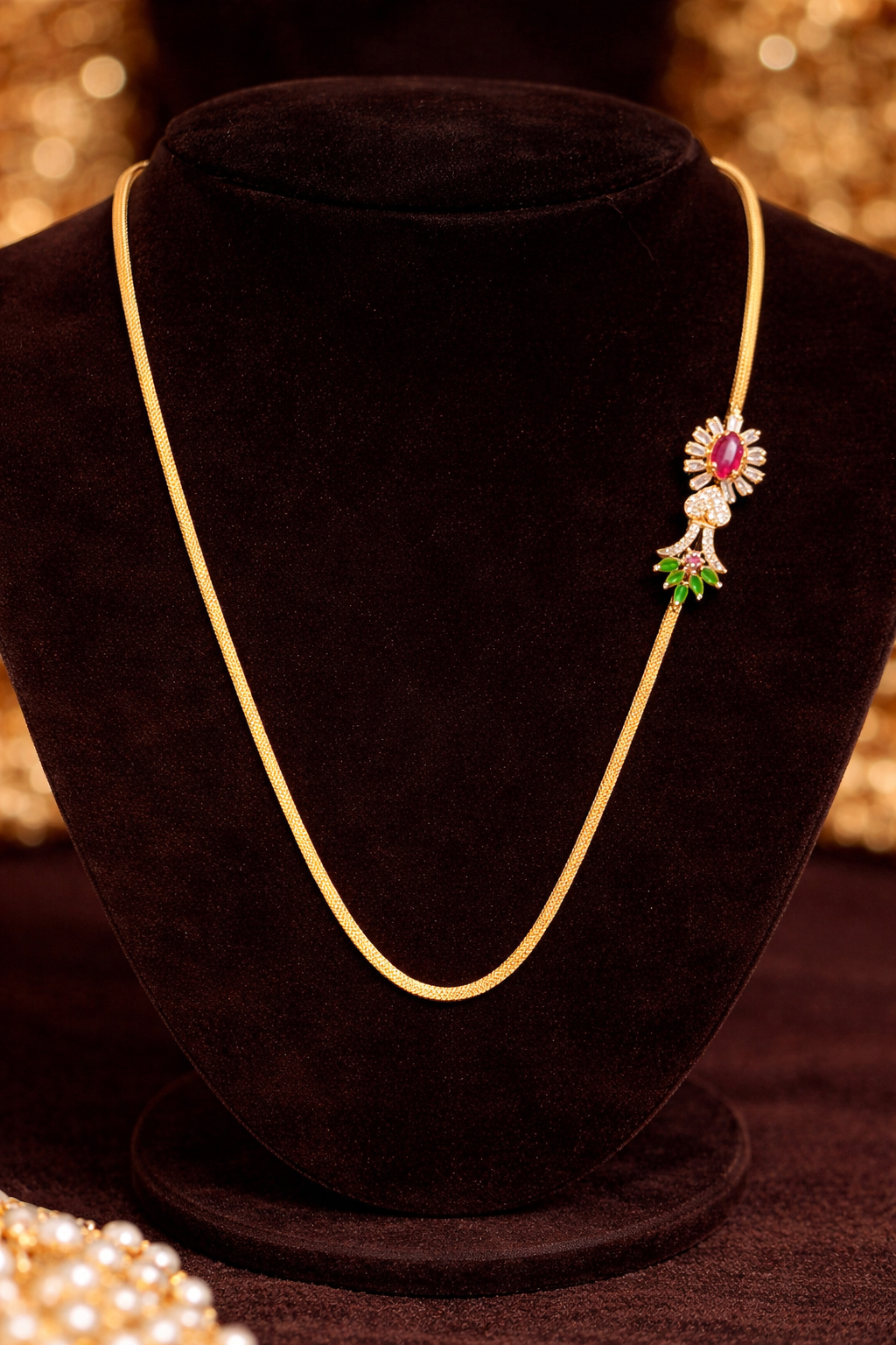 This elegant Ruby-Green Traditional Mangalsutra Chain features a classic gold-tone chain highlighted with a vibrant ruby-colored center stone and delicate green bead accents. Designed to reflect traditional charm with a refined modern finish, the side pendant detailing adds uniqueness without overpowering the simplicity of the chain. Lightweight and comfortable, this mangalsutra is ideal for daily wear, festive occasions, and traditional functions. A perfect choice for women who value heritage designs with subtle color elegance.