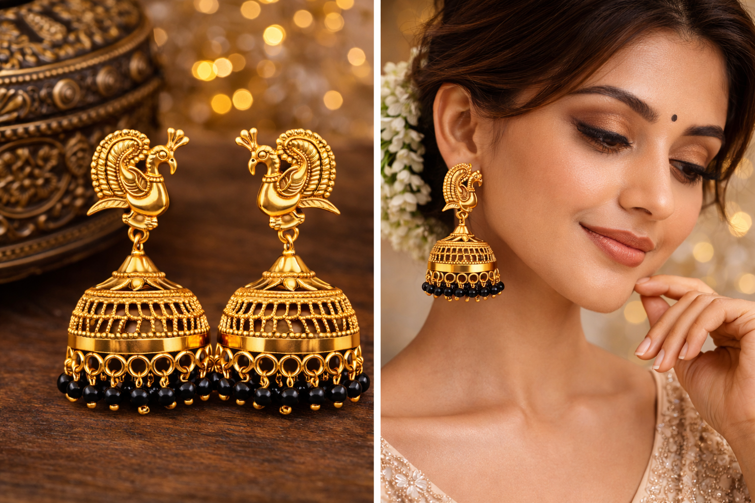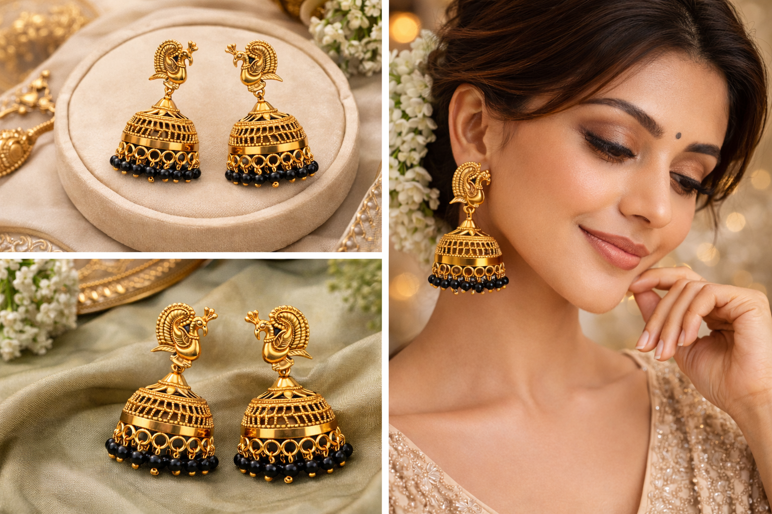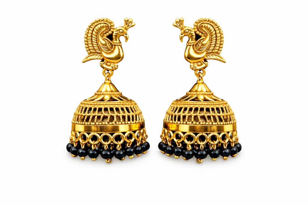 Celebrate timeless tradition with these beautifully crafted peacock-style black jhumka earrings. Designed with an intricately detailed peacock motif at the top, the earrings flow into a classic dome-shaped jhumka adorned with fine filigree work and delicate hanging beads. Inspired by temple jewelry aesthetics, this traditional design adds grace and richness, making it perfect for festivals, weddings, poojas, and ethnic celebrations. A must-have piece to complement sarees, silk outfits, and traditional attire.