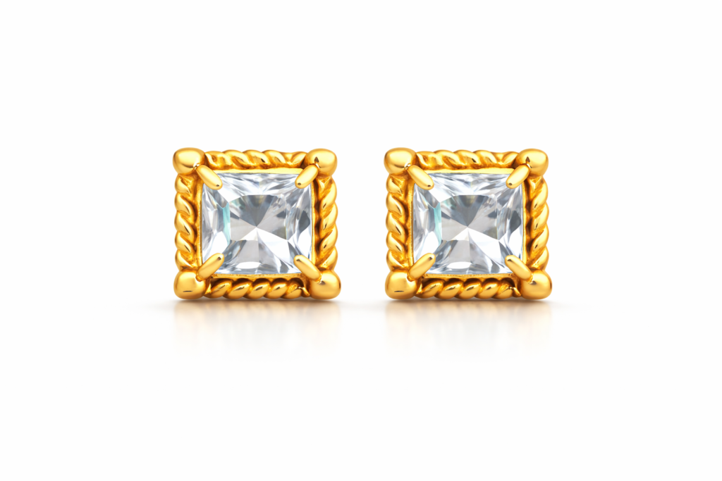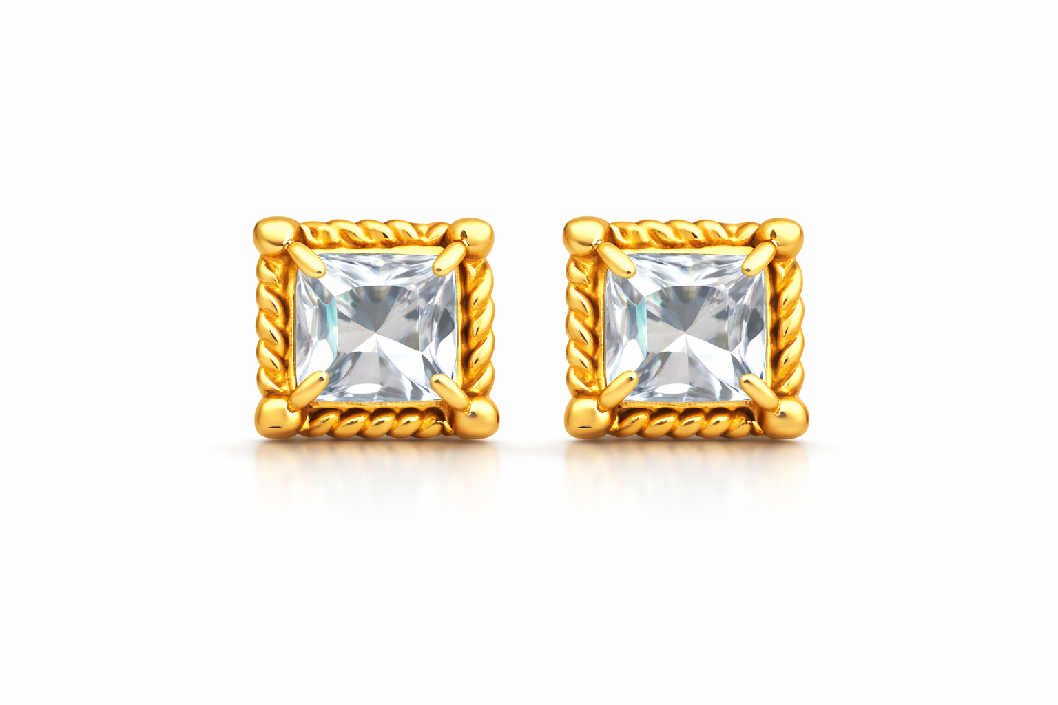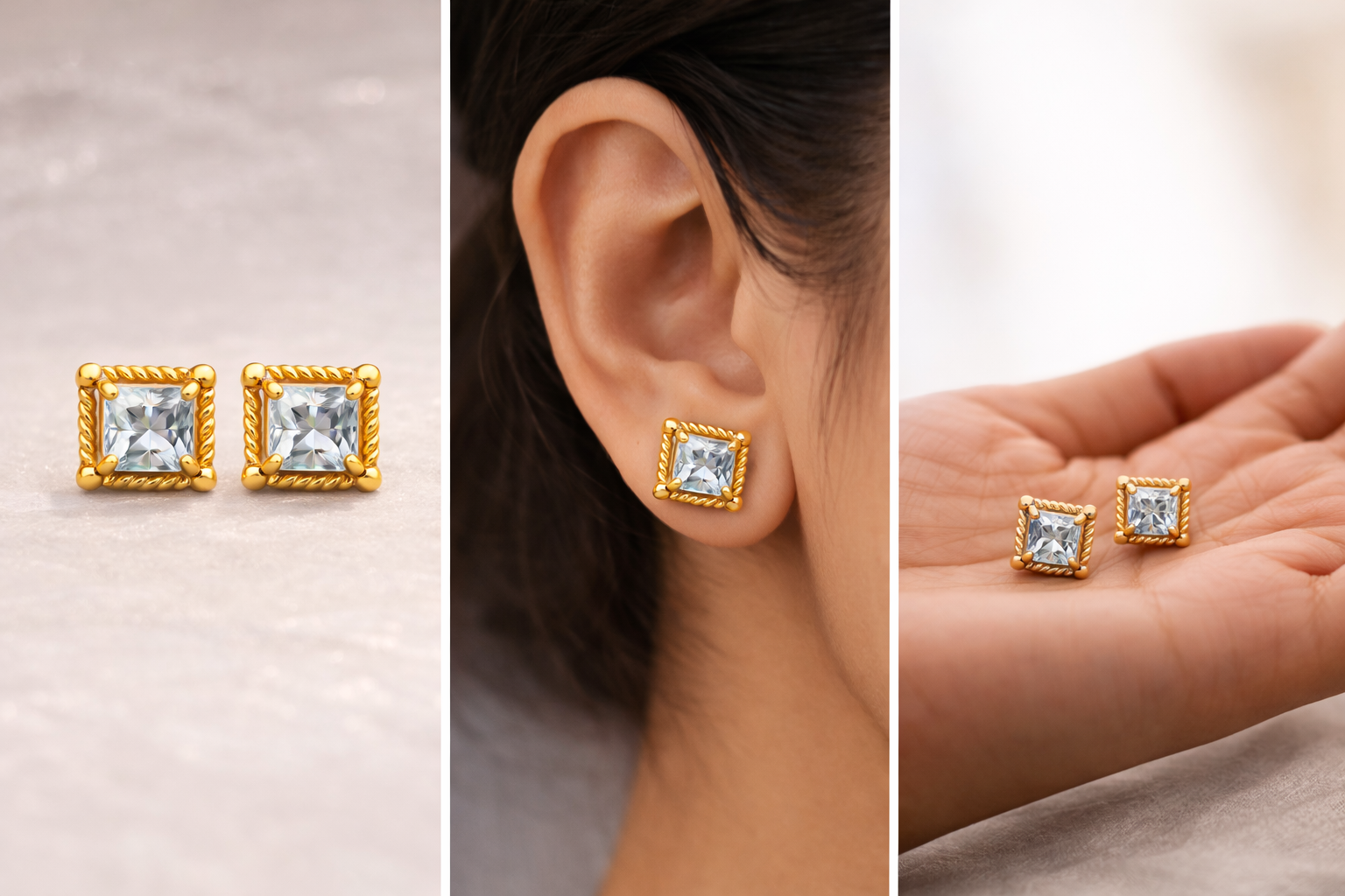 Clean, bright white stones catch the light softly, while the gold-edged square design gives just enough definition to stand out without being loud. They sit perfectly on the ear, feel light all day, and match almost everything you wear — from daily outfits to special moments.